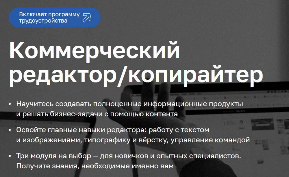 Профессия копирайтер PRO от Skillbox — лучший выбор для тех, кто хочет оказывать услуги по копирайтингу. Здесь вас научат разрабатывать контент-стратегию, работать с разными форматами, писать для разной аудитории, красиво оформлять текст и работать с заказчиками. Кроме того, есть помощь в трудоустройстве.