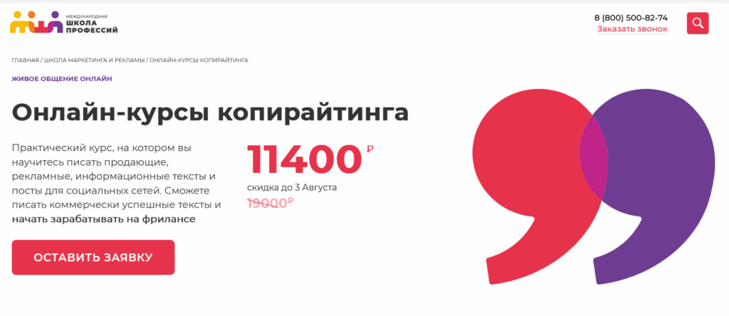 Компания предлагает 6-месячные курсы по обучению профессии «Копирайтер-маркетолог». За 97 записанных уроков вы изучите все форматы текстов (SEO, информационные, продающие, для соцсетей, лендингов и пр.), инфографику, верстку и оформление статей, редактуру и подготовку материала к публикации в печатные издания. Бонусом даются методички, PDF-инструкции, чек-листы.
