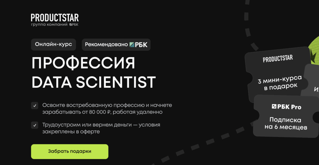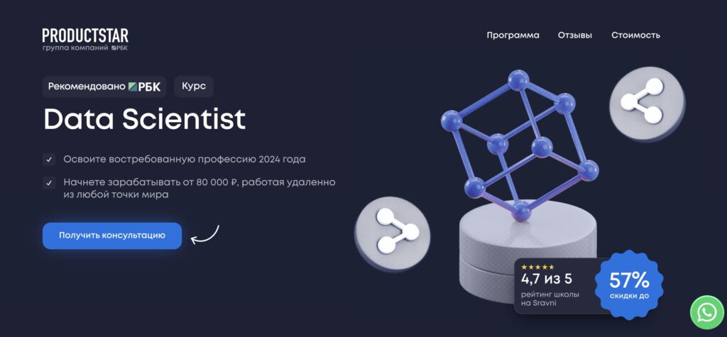 Курс «Профессия Data Scientist» от ProductStar — это онлайн-программа, рассчитанная на 10 месяцев, которая позволяет освоить востребованную профессию с нуля. Курс ориентирован на тех, кто хочет научиться работать с большими данными, строить прогнозные модели и применять машинное обучение для решения бизнес-задач. Программа включает в себя 250 академических часов и 128 онлайн-уроков, что позволяет глубоко погрузиться в профессию и получить необходимые навыки.