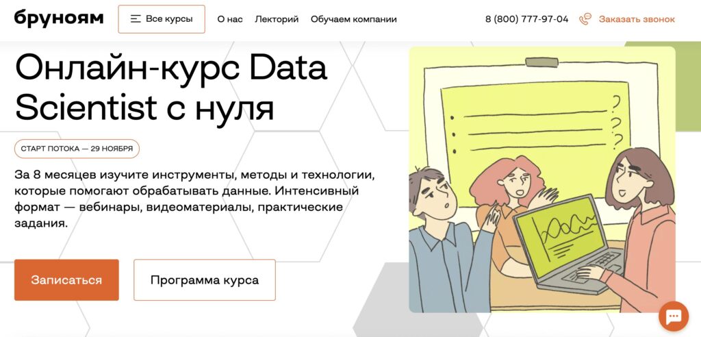 Курс продолжительностью 9 месяцев ориентирован на новичков, не имеющих опыта в программировании или анализа данных, и построен так, чтобы шаг за шагом научить студентов всем ключевым навыкам, необходимым для работы в сфере Data Science.