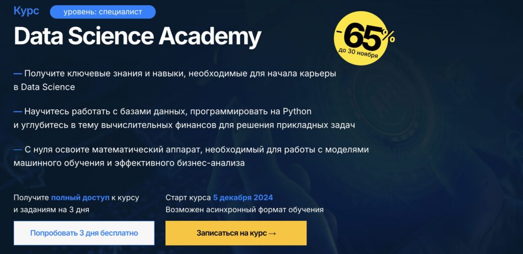 Интенсивная программа обучения, рассчитанная на 4 месяца. Она охватывает ключевые аспекты Data Science, начиная с базовых навыков программирования и заканчивая моделированием финансовых инструментов.