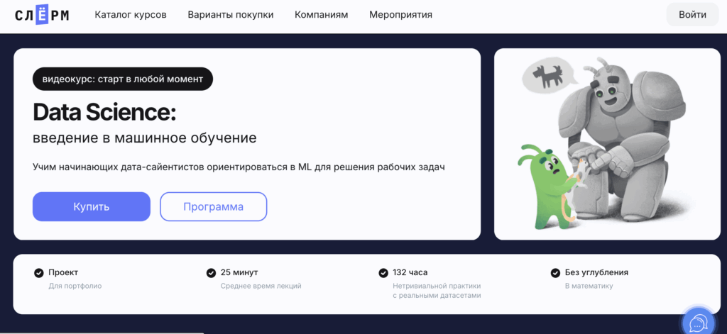 Курс «Data Scientist» от Slurm — это практико-ориентированная программа, рассчитанная на начинающих специалистов, которые хотят освоить машинное обучение и научиться применять его для решения реальных бизнес-задач. Курс включает 132 часа практики с использованием реальных датасетов и охватывает ключевые темы Data Science без излишнего углубления в математику.