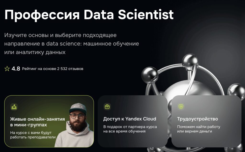 Курс «Специалист по Data Science» от Яндекс.Практикума — это программа онлайн-обучения, рассчитанная на 8 месяцев, которая позволяет освоить профессию Data Scientist с нуля. Курс ориентирован на тех, кто хочет изучить анализ данных, машинное обучение и научиться применять эти навыки в реальных бизнес-задачах. Обучение проходит в гибком формате, что позволяет совмещать его с работой или учёбой.