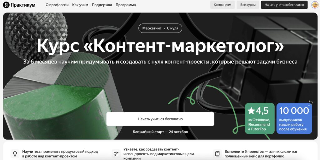 Курс «Контент-маркетолог» от Яндекс Практикума представляет собой комплексную онлайн-программу обучения, рассчитанную на 6 месяцев. Программа разработана для тех, кто хочет освоить профессию контент-маркетолога с нуля или структурировать имеющиеся знания в этой области. Курс охватывает широкий спектр тем: от основ маркетинга и анализа целевой аудитории до создания различных типов контента и работы с аналитикой. Студенты работают над реальными проектами, формируя портфолио из выполненных заданий.