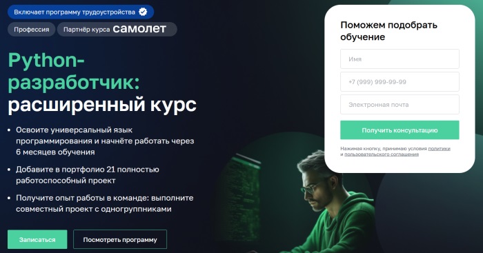 Большой курс по Python-разработке, в ходе которого вы освоите Пайтон, выполните 21 полноценную работу и поучаствуете в проектах от компании сразу «Самолет».