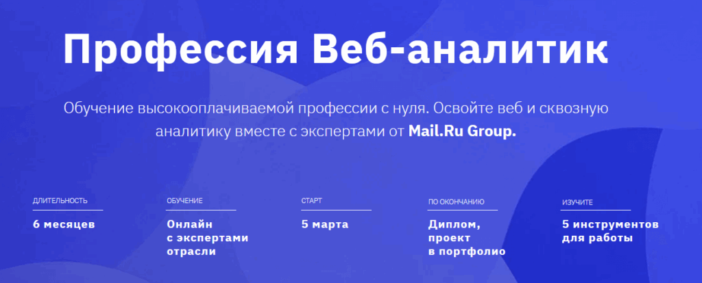 Это наиболее объемный курс, позволяющий изучить web-аналитику с нуля до уровня Pro. После него предусмотрена помощь в трудоустройстве. Стоимость 6 658 руб./ мес.