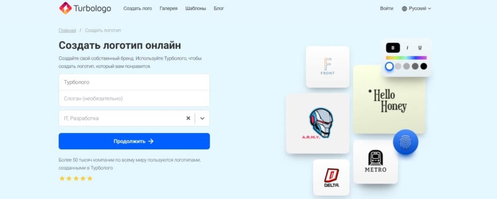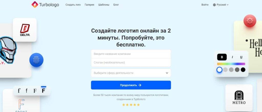Турболого — простой и удобный сервис для разработки логотипа. Генератор работает по технологиям ИИ, благодаря чему выдает сотни вариантов дизайна логотипа за секунды. Сервис адаптирован для обычных пользователей и дополнен понятными инструкциями.
