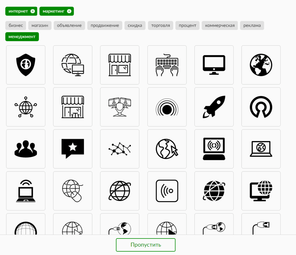 Помимо выбранных изображений, сервис подберет еще десятки вариантов подходящих иконок, основываясь на указанных данных о компании.