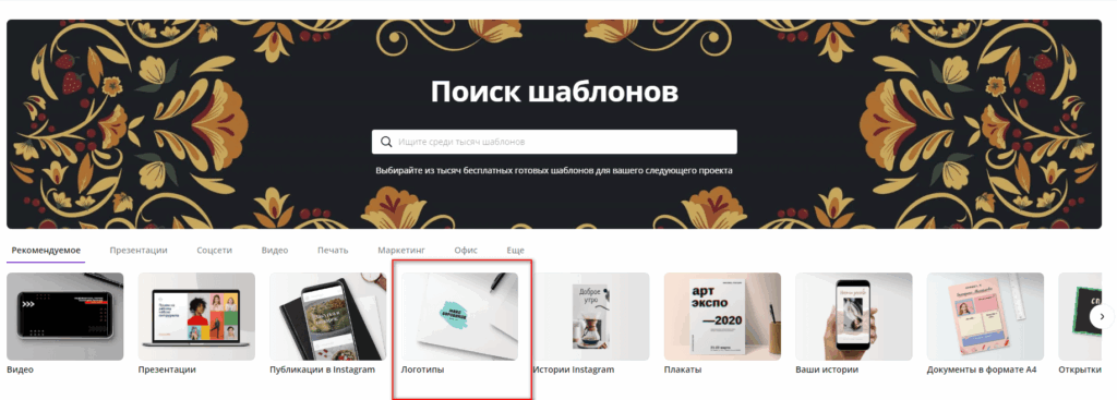 1. Зайдите в шаблоны и выберите «Логотипы»