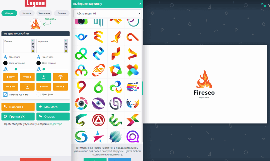 После система предложит варианты, которые можно отредактировать и/или скачать. Логотипы бесплатные.