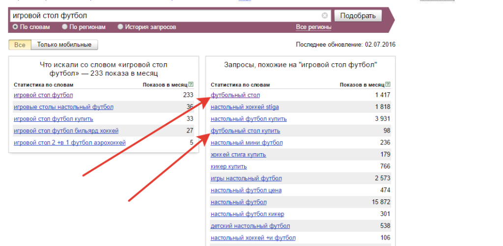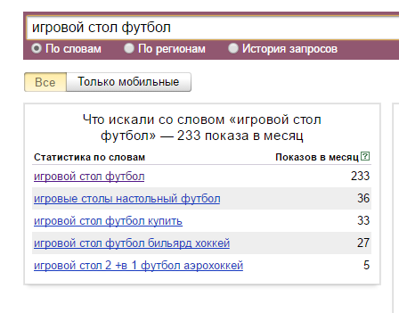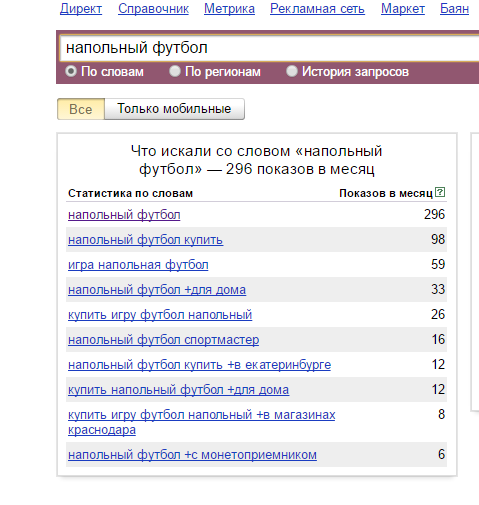 Вбиваем общий запрос «напольный футбол» и видим следующую картину.