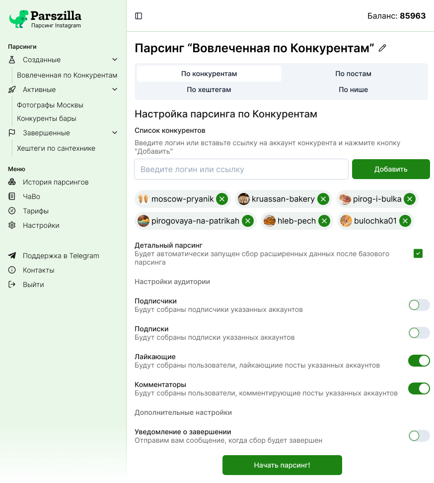 Инстаграм-парсер Парсзилла позиционирует себя, как супер-быстрый сборщик данных об инстаграм-аккаунтах.