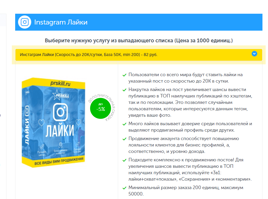 Prskill позиционируется себя как сайт № 1 SMM-продвижения на территории стран СНГ. На нем можно купить 20 различных услуг для продвижения в Инстаграме. Кроме стандартной накрутки есть: