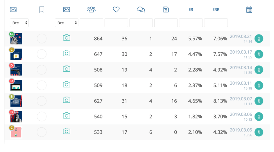 Сайт позволяет получить статистику уже через 3 часа после публикации поста. Оцениваются скорость набора лайков, вовлеченность и охват, качество аудитории. Есть статистика сториз и хештегов. Площадка будет отмечать длину и тип постов, чтобы вы смогли понять, какой контент предпочитает аудитория. Имеется сортировка постов по лайкам, комментариям, охвату.