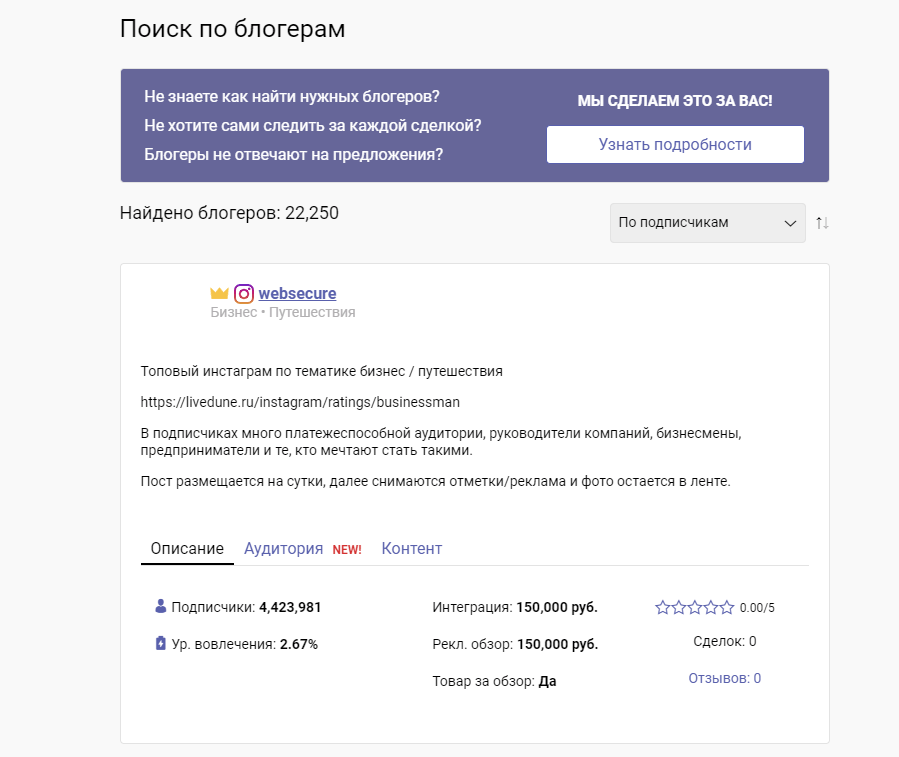 Биржа с базой в 30+ тыс. блогеров. Она анализирует каждого из них по многим показателям (подписчики, их интересы и пр.), а также проверяет на накрутку. Также платформа определяет оптимальную стоимость размещения рекламы у каждого блогера.