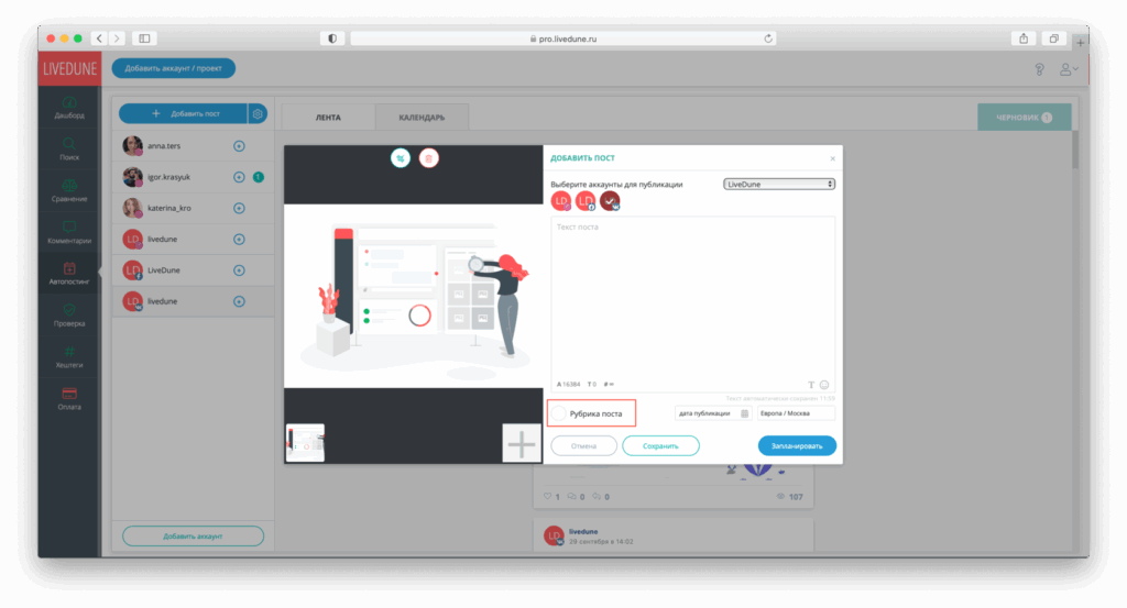 Важно: Livedune работает через официальное API Инстаграм. Оно разрешает управлять учетными записями через это приложение. Метод полностью белый, правда, возможности автопостинга в официальном API пока нет.