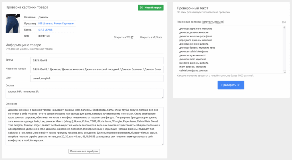 - SEO анализ карточки по артикулу. Детальный отчет по позициям любого товара в поиске WB