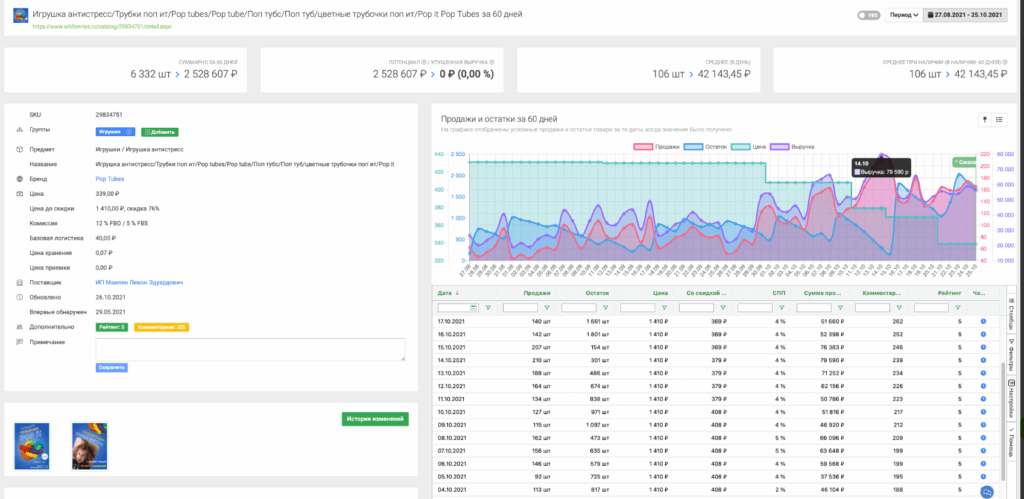 Вы можете отследить, кто еще продает интересующий товар. В анализе будут отображены рейтинг, выручка, объемы продаж и стоимость у конкурентов. Это поможет понять, стоит ли завозить такую же продукцию или лучше выбрать другую, у которой меньше продавцов.