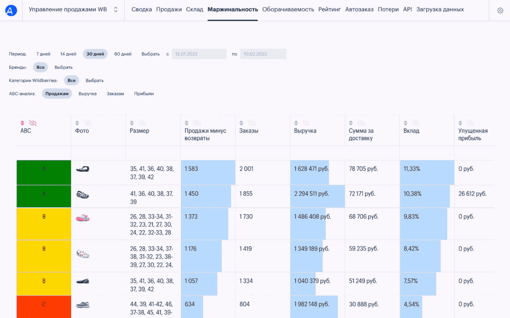 Очередная площадка, которая поможет управлять продажами и следить за конкурентами на Вайлдберриз. Она проанализирует ваши товары по восьми показателям и найдет самые прибыльные, а также те, от которых стоит избавиться.