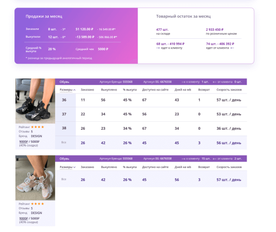 Платформа подходит для внутренней аналитики продаж на Вайлдберриз. У нее удобный и понятный интерфейс, в котором ориентироваться проще, чем в личном кабинете маркетплейса. Она покажет: