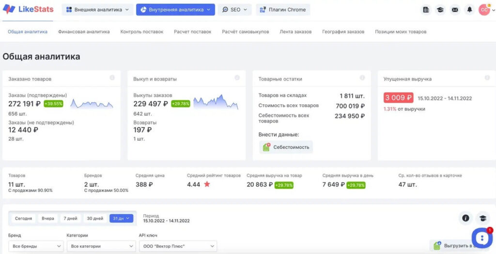 Также такие площадки занимаются как внешней, так и внутренней аналитикой. То есть они будут собирать статистику по вашим личным продажам на маркетплейсе. Они предоставляют больше данных, чем есть в личных кабинетах маркетплейсов и зачастую более наглядные.