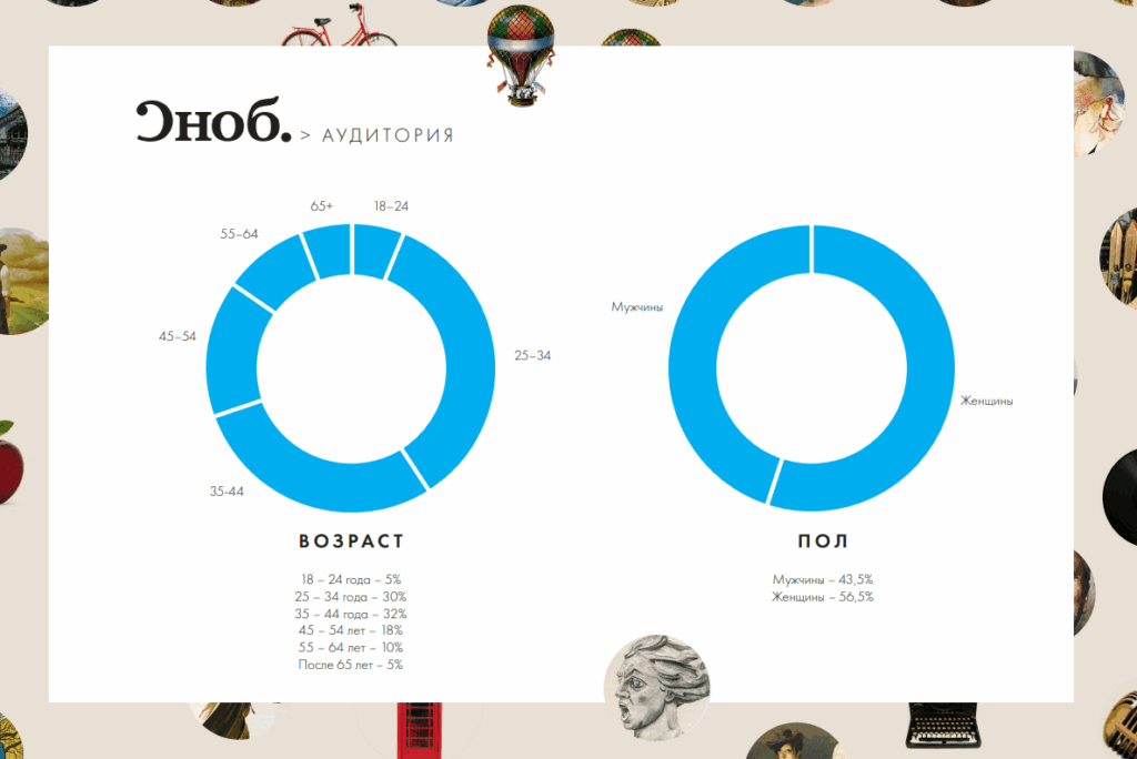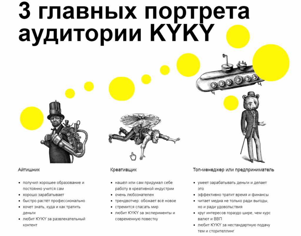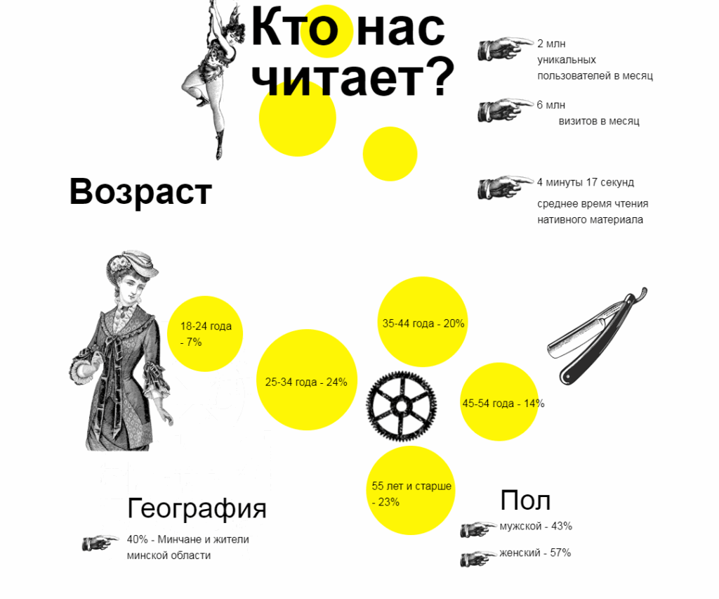 Пример необычного оформления презентации можно найти у белорусского новостного портала Kyky. Издание представило статистику в виде инфорграфики, а также расписало портреты аудитории.