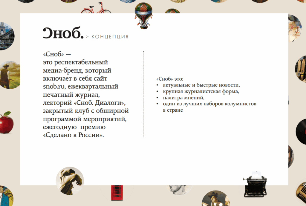 Разберем структуру презентации на примере медиакита журнала Сноб.