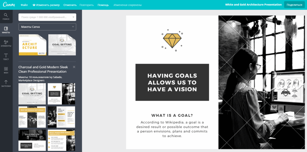 Те, кто хочет создать медиакит самостоятельно, могут обратиться к сервису Canva. В нем имеются шаблоны для презентаций, на основе которых можно составить свою. Можно использовать блоки из разных шаблонов (например, из инфографики) или вставлять собственные изображения. Готовый файлик скачивается в PDF.