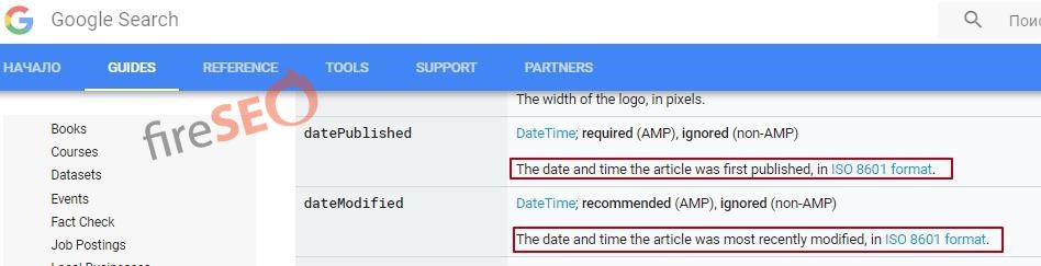 После того, как добавили разметку автора, добавляем данные о времени постинга статьи и о времени последней редакции. Чтобы правильно вывести время, надо учитывать, что гугл поддерживает только определенный формат данных.