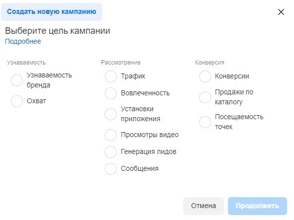 Если вы хотите настроить таргетированную рекламу с нуля, необходимо зайти в Ads Manager (через в Facebook). Там вы создаете кампанию и настраиваете цели. От ее выбора зависит стратегия рекламы.