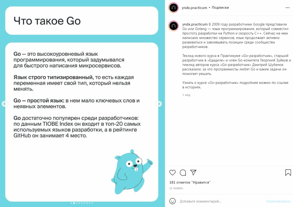 Сейчас в тренде оформлять посты в карусели. Такой прием позволяет вместить в пост больше 2200 знаков, а также поднять вовлеченность. Благодаря тому, что пользователи перелистывают картинки в карусели, они создают больше точек взаимодействия с профилем, что нравится алгоритмам.
