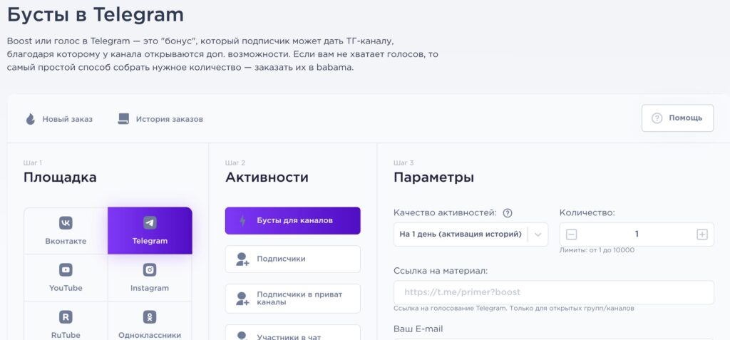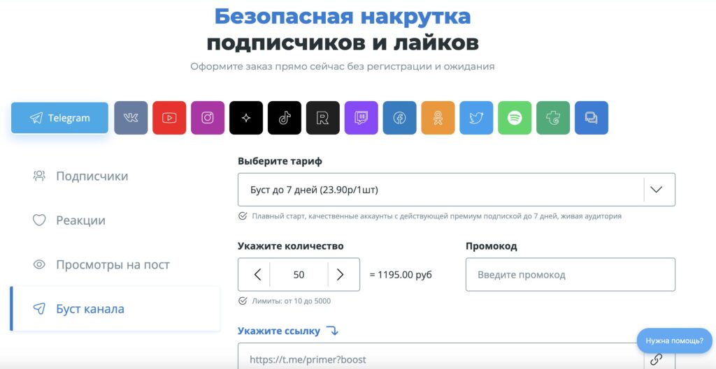 Надежный и проверенный сервис, предлагает накрутку бустов от реальных, живых аккаунтов с премиум-подпиской. Есть разные тарифы, стоимость одного буста начинается с 24 руб.