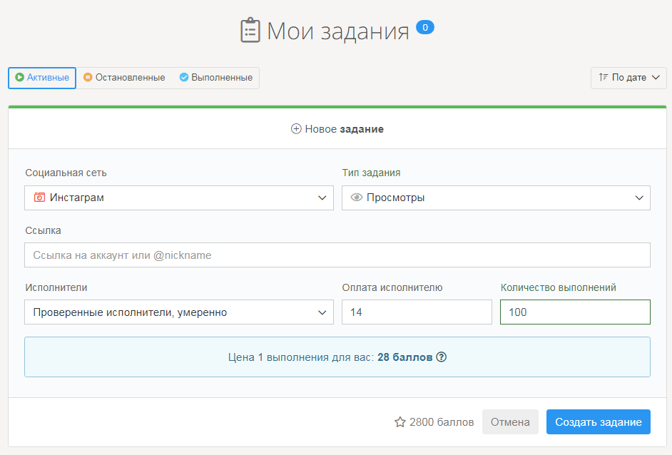 Стоимость заказа указывается в баллах, которые нужно купить при пополнении счета. Чем больше вы купите баллов, тем дешевле они обойдутся. Цена — от 0.025 до 0.05 руб.