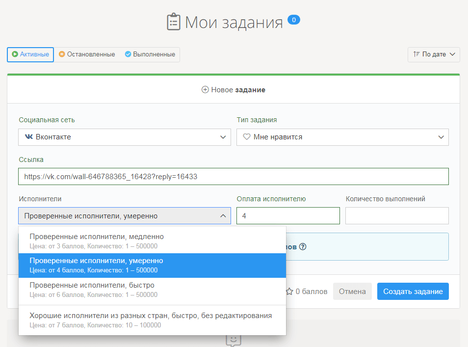 Лайфхак: вы можете пользоваться услугами сервиса условно бесплатно. Для этого необходимо стать в нем исполнителем. Вы будете ставить лайки, смотреть видео, подписываться на чужие аккаунты и за это получать вознаграждение. Его вы можете потратить на раскрутку своего комментария.