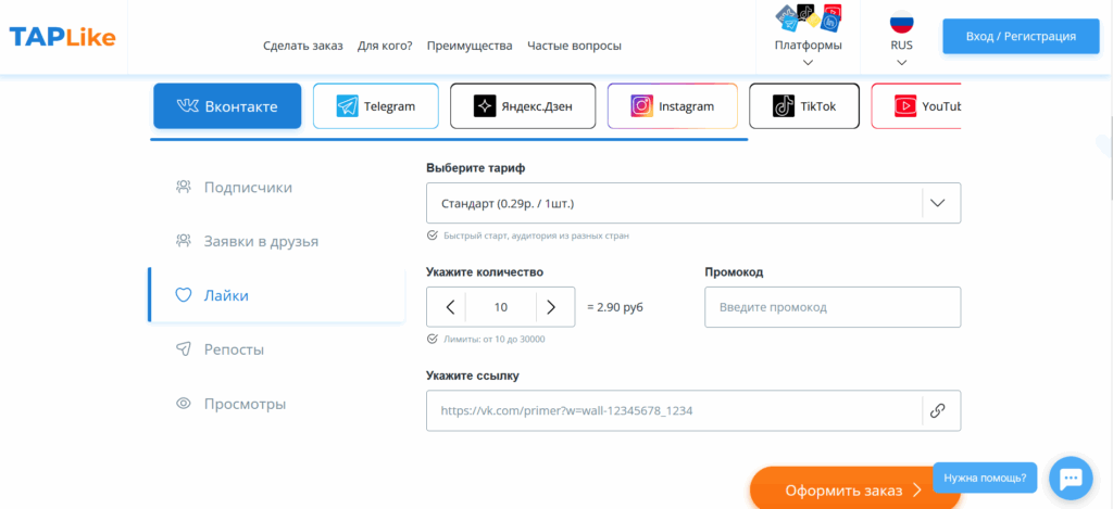 Эта площадка для накрутки работает с самым большим количеством соцсетей. У нее множество тарифов, в которых можно заказать все виды реакций.