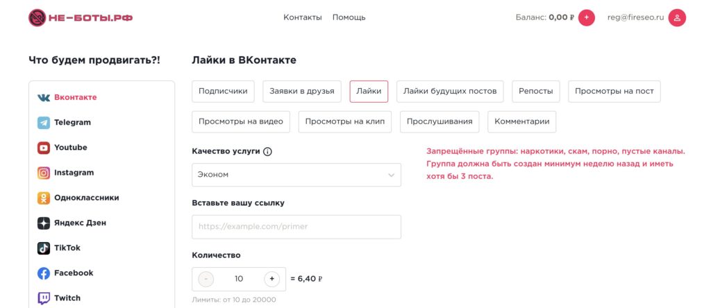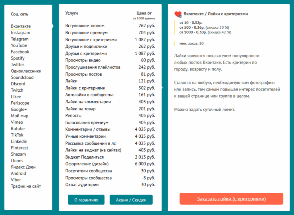 Неплохой сервис, если нужно много быстрых лайков. Работает со многими сетями. Может накрутить ботов или живых людей. Последние, конечно же, будут дороже – 0,96 руб. за лайк против 0,24 руб.