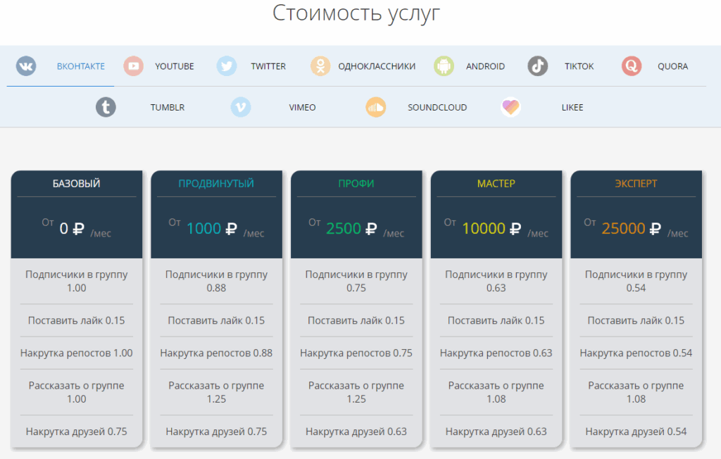 Еще одна биржа по обмену активностями. Участники зарабатывают поинты, которые можно обменять на лайки. Здесь есть требования к аккаунтам: чем больше записей и друзей, тем дороже услуги. Это выгодно как исполнителям, так и рекламодателям – накрутка будет идти с качественных профилей.