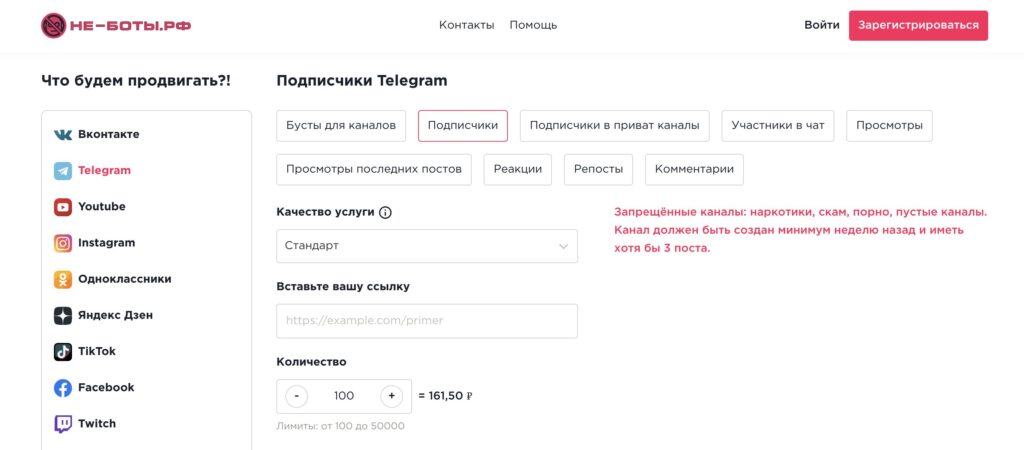 Известный сервис рунета, где можно быстро и недорого накрутить подписчиков в Телеграм и не только. Сервис обещает: