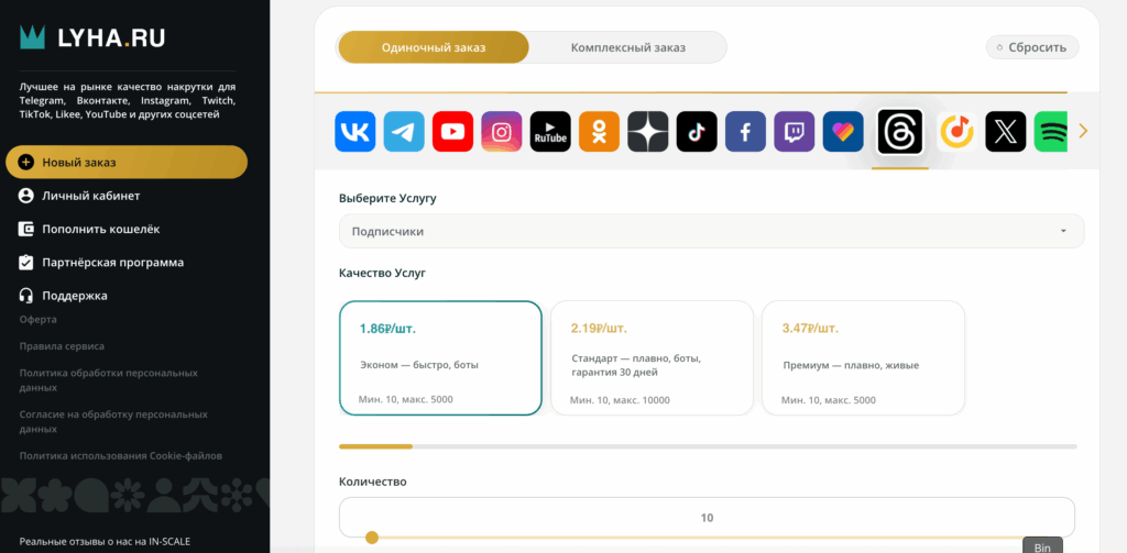 Удобный сервис для накрутки подписчиков в Threads. Здесь доступны все основные соцсети и мессенджеры: Макс, ВКонтакте, Телеграм и другие. Хорошее решение для постоянного продвижения.