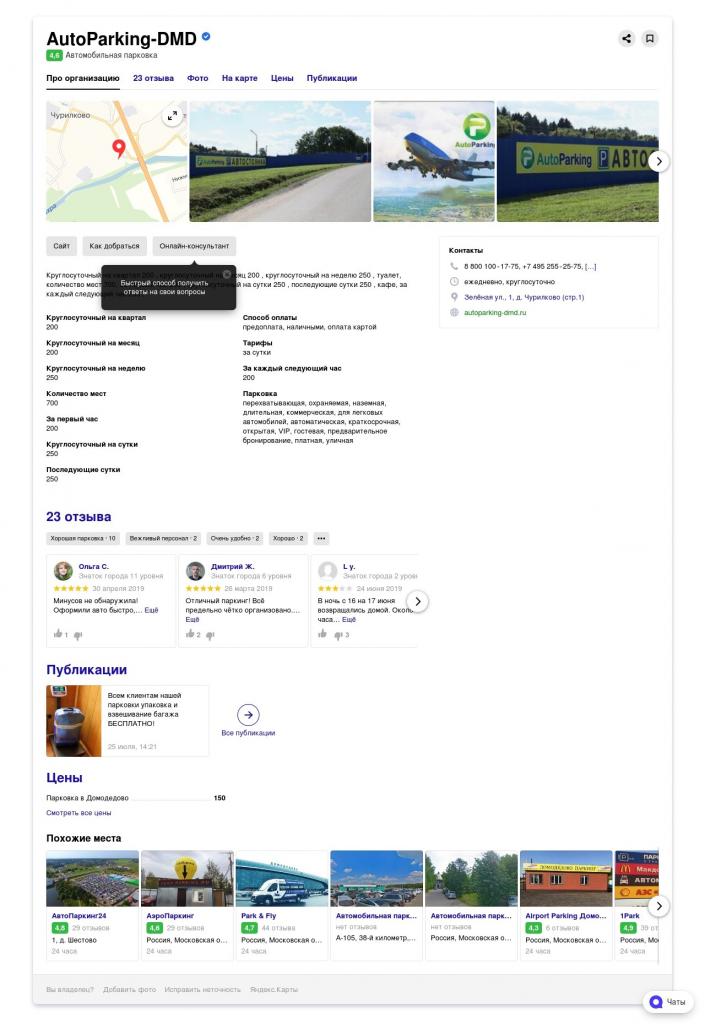 Пример заполнения карточки в Яндекс Справочнике для клиента агентства FireSEO. Компания предоставляет услуги парковки возле аэропорта Домодедово. Этапы работы: