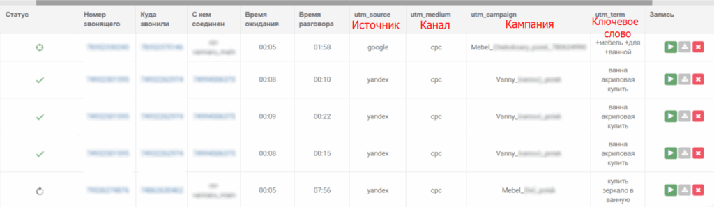 Отчет из журнала звонков Ringostat. Здесь видны источник, канал и рекламная кампания, которые привели клиента на сайт перед звонком.