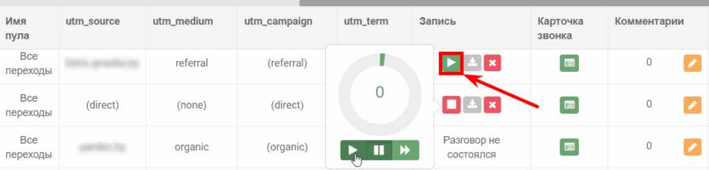 В интерфейсе коллтрекинга записи звонков обычно отображаются в журнале звонков. Здесь приведен пример интерфейса сервиса Ringostat, в других сервисах он будет выглядеть иначе