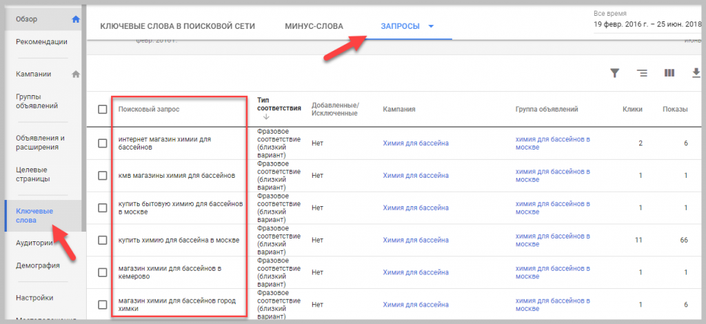 В Google Ads нужно перейти на вкладку Ключевые слова — Запросы