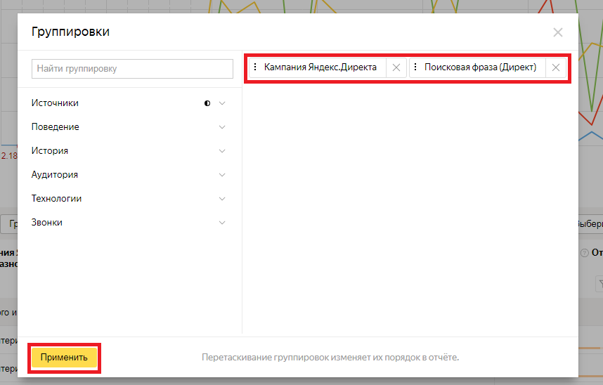 Убираем все, кроме «Кампании Яндекс.Директ и Поисковая фраза (Директ)»:
