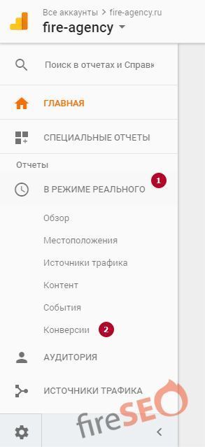 — Можно попросить специалиста по контекстной рекламе проверить — фиксируются ли цели Яндекс и Гугл. Либо проверьте самостоятельно фиксацию целей Гугл в Аналитике в режиме реального времени. Для этого нужно: зайти на Гугл Аналитикс и в левом меню выбрать Режим реального времени: