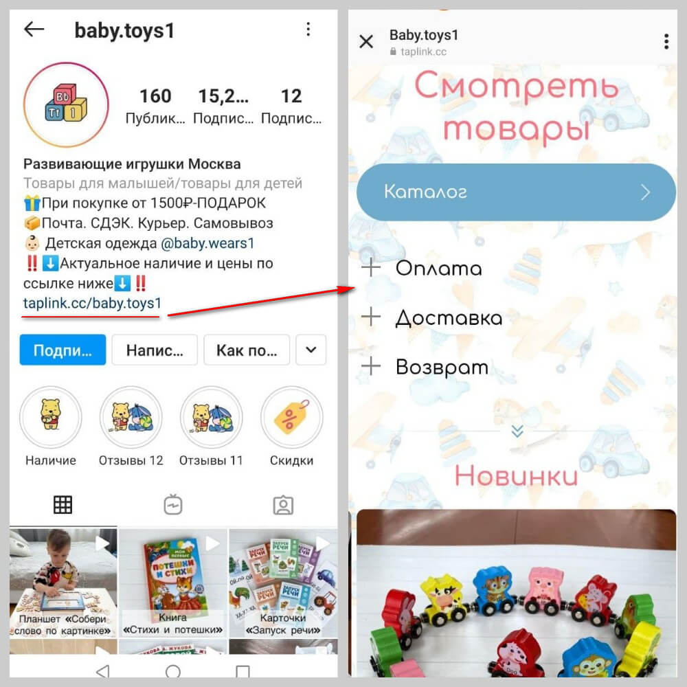 Наличие такой ссылки позволит собрать ассортимент, разместить всю важную информацию о бренде и добавить различные варианты связи. Пользователям не придется изучать всю ленту, чтобы найти нужную для себя информацию.