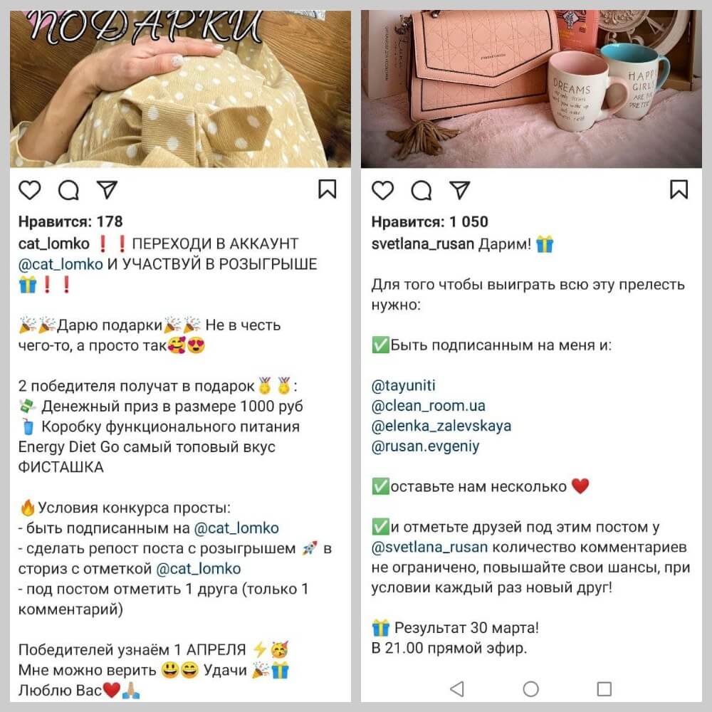 Суть конкурсов проста: вы разыгрываете подарок среди участников. Условия конкурса – поставить лайк, подписаться и отметить 1–2 друзей в комментариях. Можно объединиться с другими продавцами со схожей услугой и аудиторией, которые также предоставят подарок (или деньги на него). В этом случае ценность приза будет выше, что привлечет больше людей.