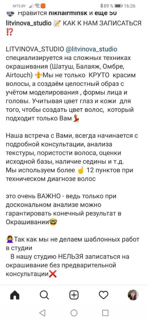 На примере ниже – топовый белорусский мастер по окрашиванию. Только в ее студии предлагается предварительная консультация для оценки качества волос. Большой упор делается на то, что после окрашивания сохраняется здоровье волос, а ведь это больной вопрос для тех, кто решил осветлиться. Разумеется, качество волос сохраняют и в других студиях, но они при этом почему-то почти не говорят.