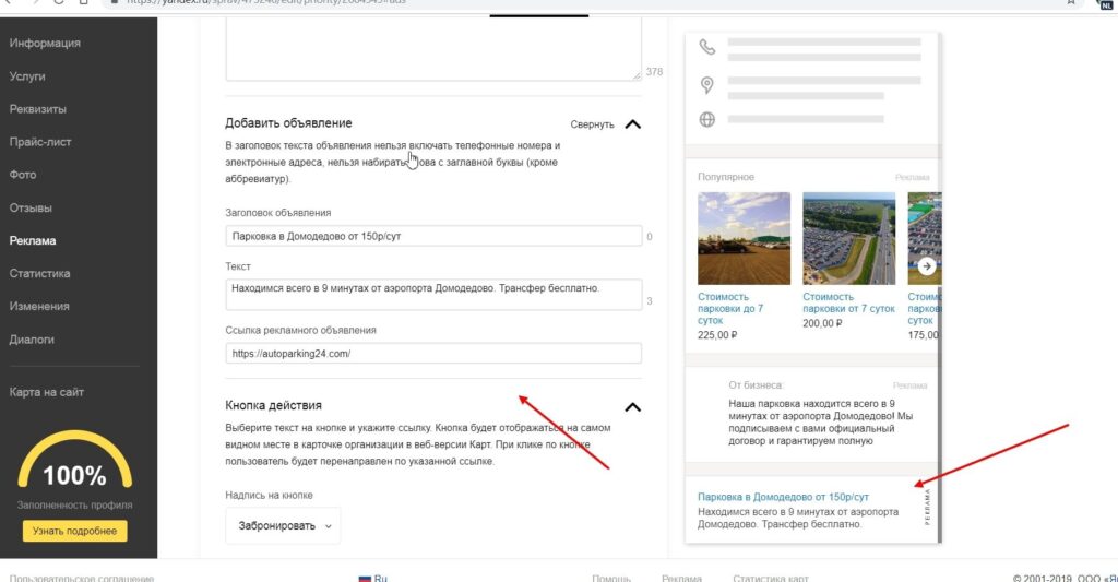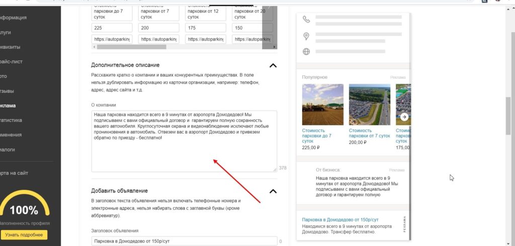 Краткое описание компании и ее конкурентных преимуществ будет отображаться в карточке на Яндекс.Картах.
