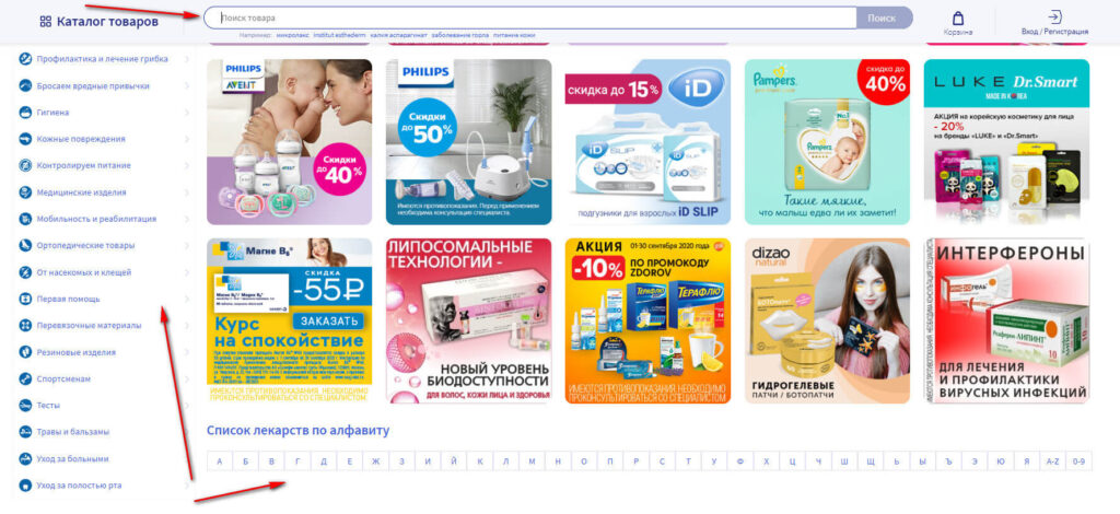 Каталог может быть классическим – категорийным. Некоторые аптеки размещают алфавитный каталог – найти лекарство проще по первой букве названия. Нужен и поиск внутри сайта, чтобы пользователь мог ввести название лекарства и отыскать его.